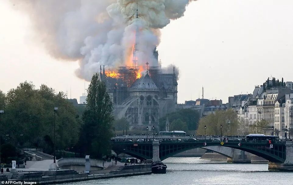 哥特式的塔尖在火中倒塌,屋顶化为一座巨坑。